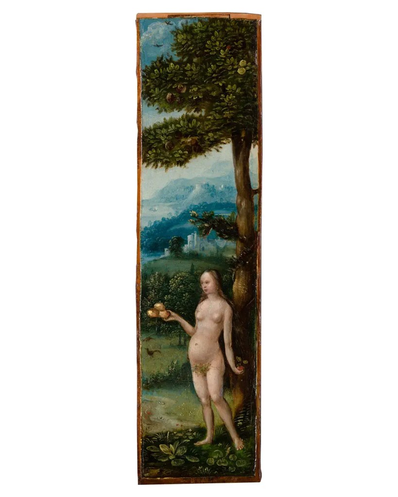Although no surviving work can be firmly documented as by Isenbrant (and this work has variously been sold as Isenbrant or his workshop or even “Flemish school”), works attributed to him will often have flaming red or dark blue set against the idyllic background of a lush, hilly landscape with castles situated on top of a vertical rock (typical for Isenbrant), with sinuous rivers and thick-leaved trees (showing the influence of Gerard David, whose workshop was nearby Isenbrandt’s in Bruges).
