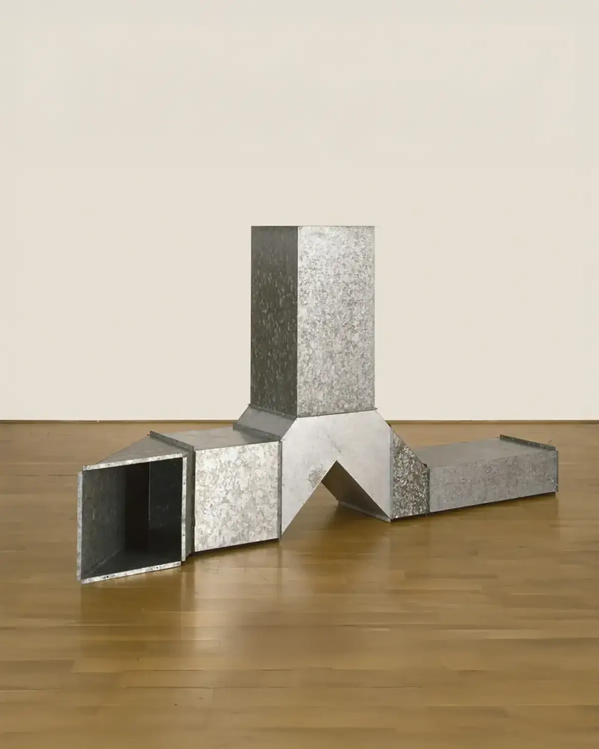 Charlotte Posenenske’s Vierkantrohre der Serie D [Series D square tubes] of 1967 is a construction set comprised of six different hollow bodies made of galvanized sheet steel: the square tube, the rectangular tube, the cubical tube, the angular piece, the transition piece, the T-shaped pipe. These basic stereometric elements, which are oriented toward volumes and direction, can be combined to create any number of configurations, which, as opposed to traditional sculpture, can basically be continued, i.e., are incomplete and variable and can adopt space-consuming architectural dimensions. These are no longer sculptures, but objects. The concept envisages a curator or buyer being able to assemble and change the installation according to his or her own criteria, which involves the artist relinquishing part of her creative authority to others. The configurations can be presented standing, lying, hanging, in series, systematically, or as one sees fit (combinations of any and any number of elements) – both indoors and outdoors. Beginning in 1967, the elements were factory reproduced as authorized reconstructions in a theoretically infinite series, with the price specified not to exceed the actual (and thus modest) cost of fabrication, plus a small fee for the gallery. By insisting on unrestricted reproducibility, limited only by the open-ended number of persons interested in buying the works, Posenenske was attempting to undermine the claim to originality and exclusivity associated with one-of-a-kind objects as well as to demonstrate the artificiality of both primary and secondary market prices. That said, her widower/executor determined not to have the authorizations continued after his death, such that when that occurred the infinite denominator of the editions became finite, thus further proving her point by giving rise to a secondary market that wouldn’t otherwise have existed.
