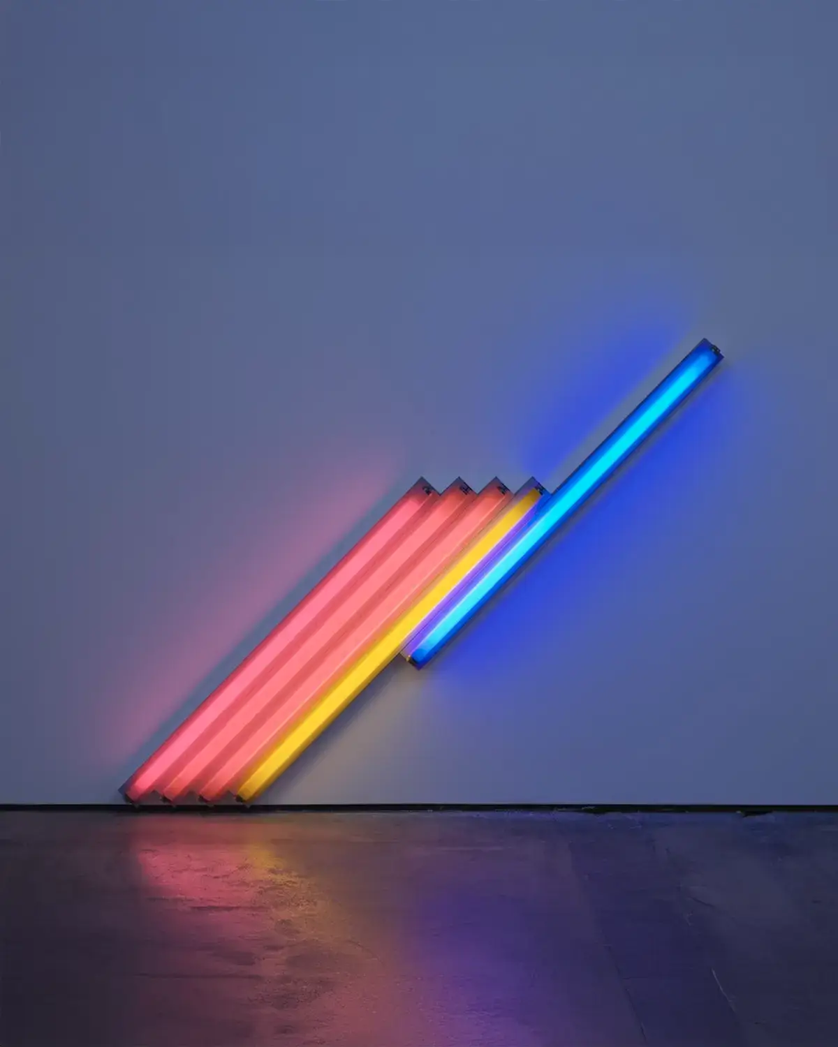 Flavin’s interest in the play of sequences and variations is clearly evidenced in Untitled (for Fredericka and Ian) 1–4 (1987), a series of four individual works that each employ the same composition of five diagonally oriented lamps, but whose colors vary according to a permutational arrangement of red, pink, yellow, blue, and green light. Whether seen separately or together, the works in this series embody what Flavin described as his goal of producing “a sequence of implicit decisions to combine traditions of painting and sculpture in architecture with acts of electric light defining space.”