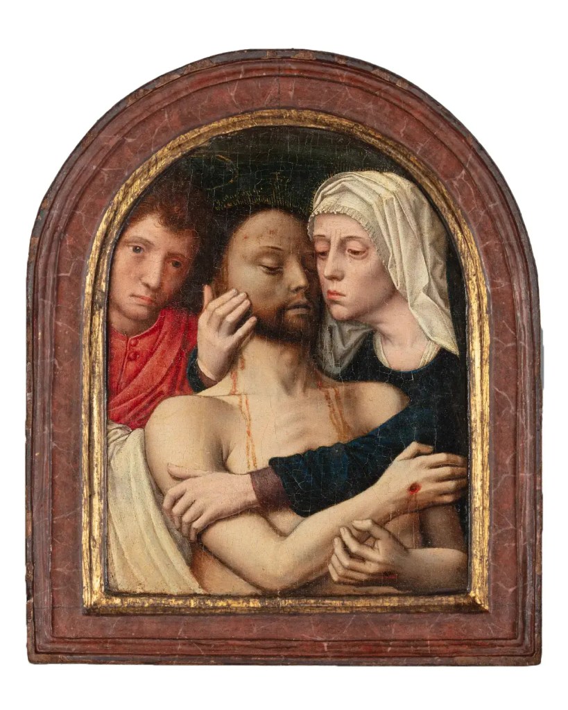 The work was described initially at TEFAF as possibly the work of Adriaen Isenbrandt or one of his associates, which is possible given Isenbrandt’s likely association with David. On inspection, Till-Holder Borchert was of the view that it was better described as within David’s own workshop. Dr. Jochen Sander, however, further confirmed the work as an autograph painting of David’s. With reference to his extensive article, Ein unbekanntes Werk Gerard Davids: Die Beweinung Christi in Halbfigur, he notes that it is “of course dependent on an earlier full-length composition of this scene but highly characteristic for the artist´s production of such small-scale variants for individual devotional practices.” In that regard, see the similarities of imagery in David’s Lamentation at the National Gallery in London, on which this work was undoubtedly modeled. It is thus of such a diminutive scale that it was almost certainly painted to function as a private devotional object, to be held in the hands, kissed or touched, and contemplated at close range rather than set up for far-sighted viewing by a large congregation.