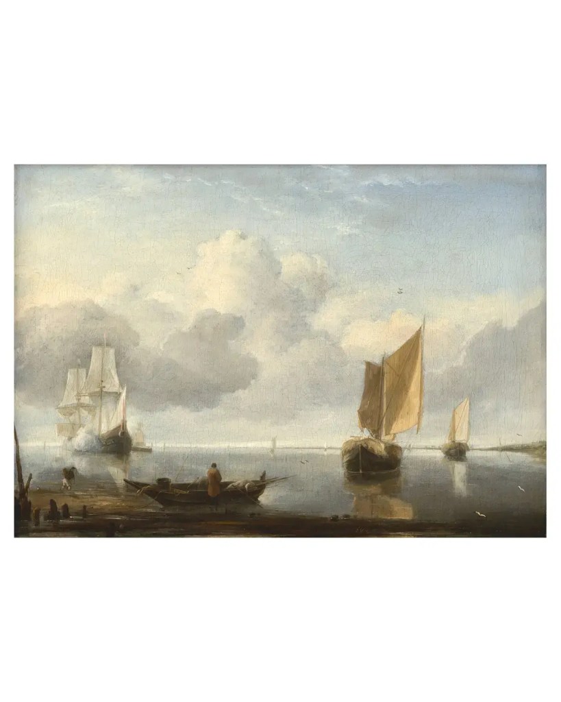 The majority of van de Cappelle’s works are marine or river views, nearly always with several vessels. He had no interest in rough seas or cloudless skies, showing large cloudy skies, with the horizon low, about 15-20% of the way up the vertical axis. The clouds are often mirrored in the dead calm water, although light ripples may be shown. As is often the case in Dutch seascapes, there is often a warship or “statenjacht,” an official yacht used for transport, official salutes and other business. The edge of the composition often slices through vessels, leaving them half seen. This painting is of a type often called “calms,” showing an all-pervading luminous atmosphere that softens all outlines and unifies forms and local colors. Or as Kenneth Clark put it: “When sky was reflected on water, there was achieved that unity of luminous atmosphere which is the whole point of van de Capelle and van de Velde.”